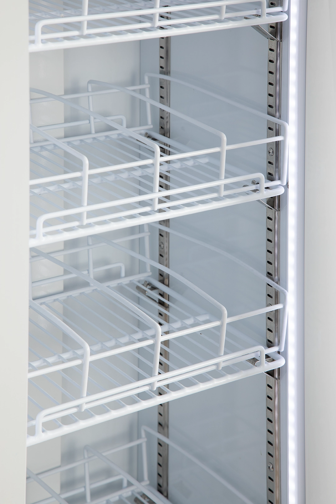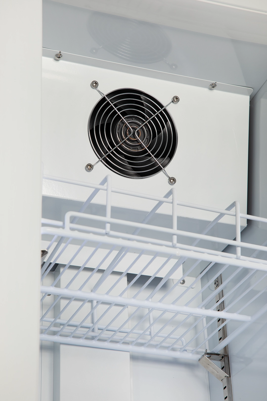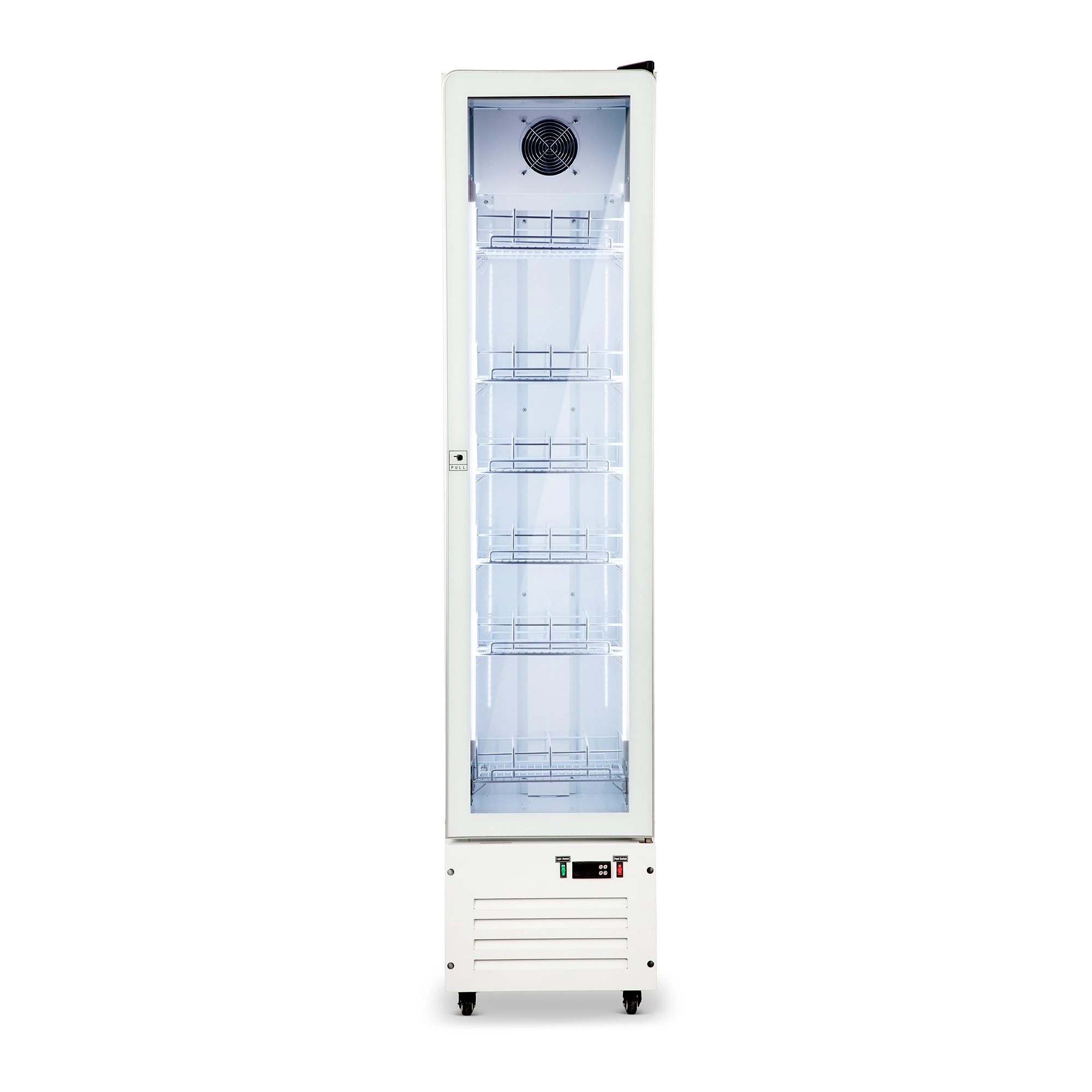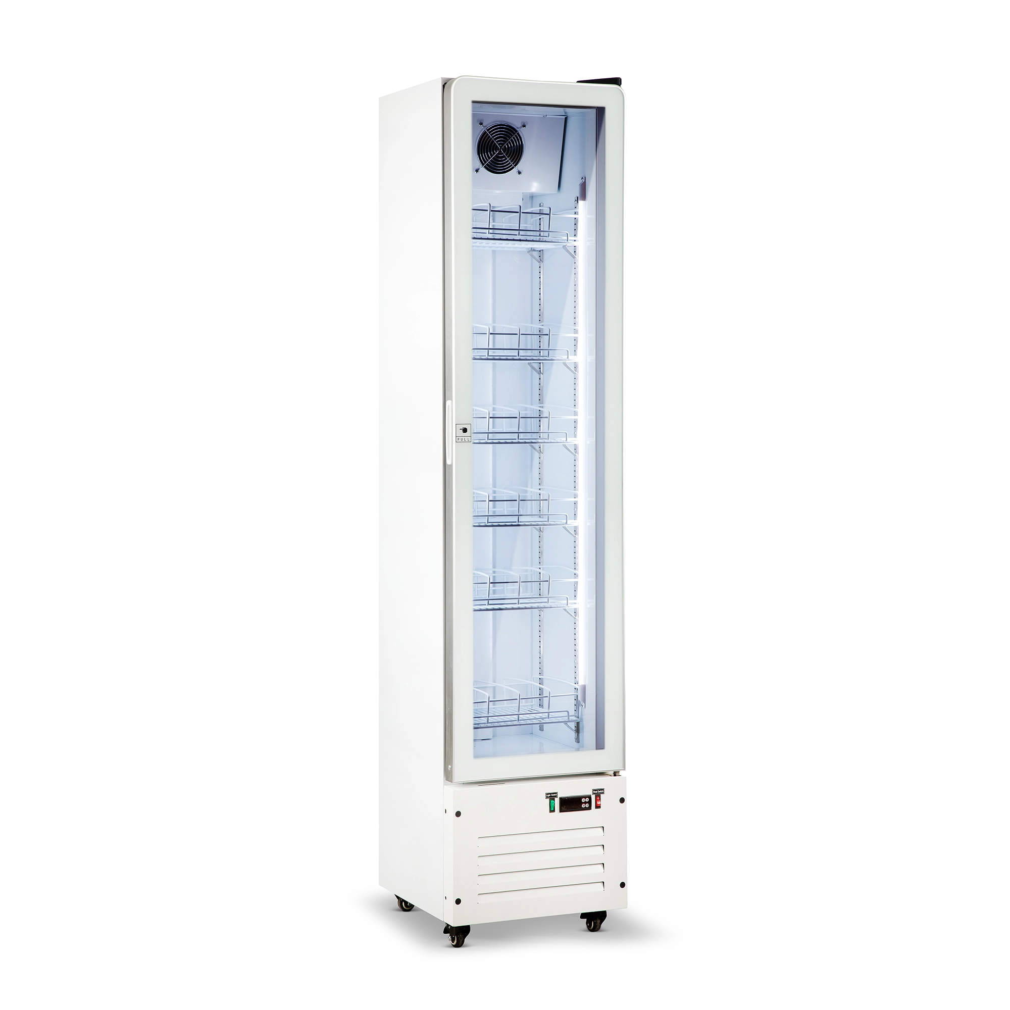 מקרר תצוגה צר לבן דלת אחת זכוכית מעוגלת, איכותי ואמין בצבע לבן בחוץ ובפנים, עם דלת זכוכית ללא מסגרת.