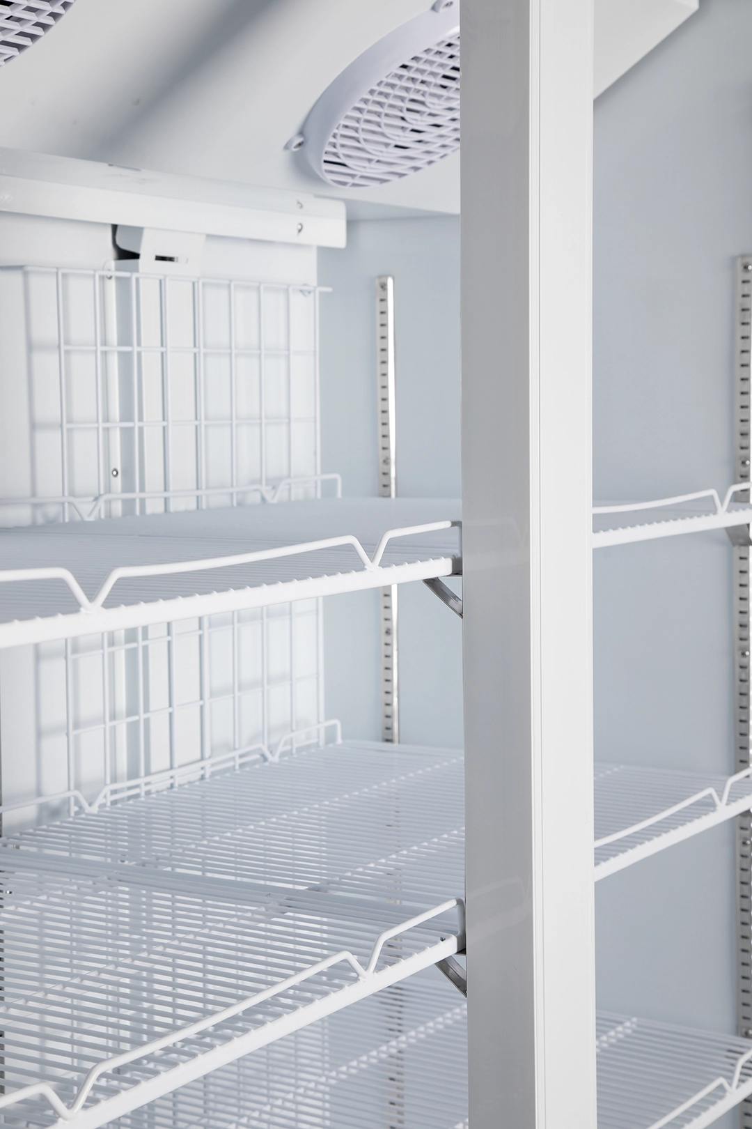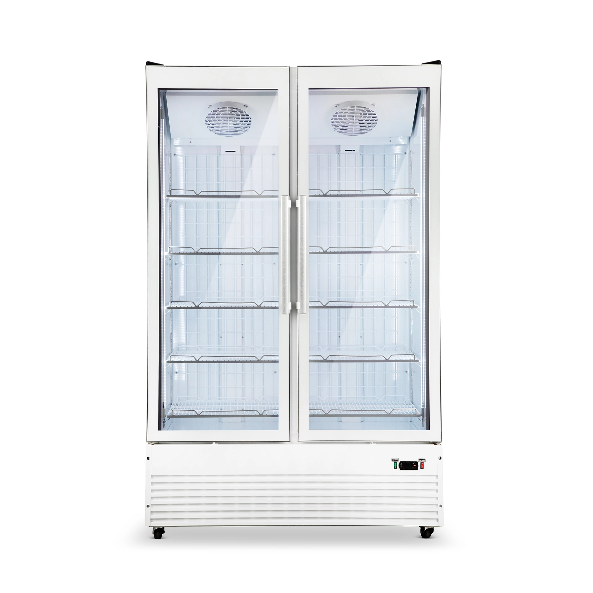 מקרר תצוגה לבן שתי דלתות זכוכית, איכותי ואמין בצבע לבן בחוץ ובפנים, עם דלתות זכוכית ללא מסגרת.